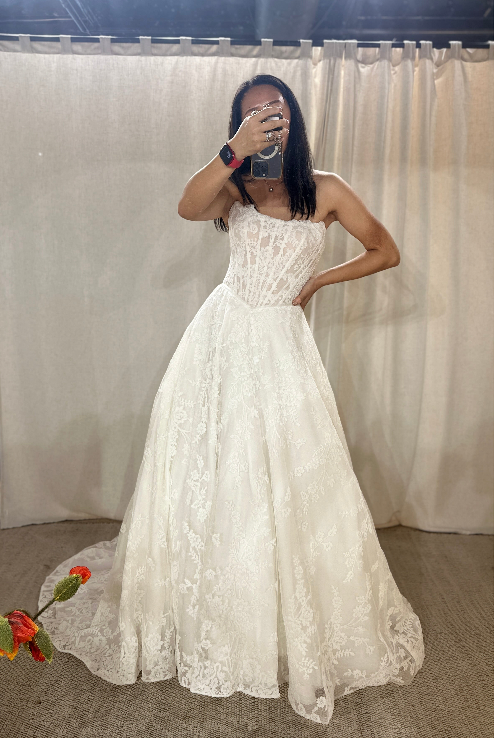 This silhouette features a fitted bodice that gradually flares out from the waist, creating an elegant and flowing shape that mimics the lines of an A.