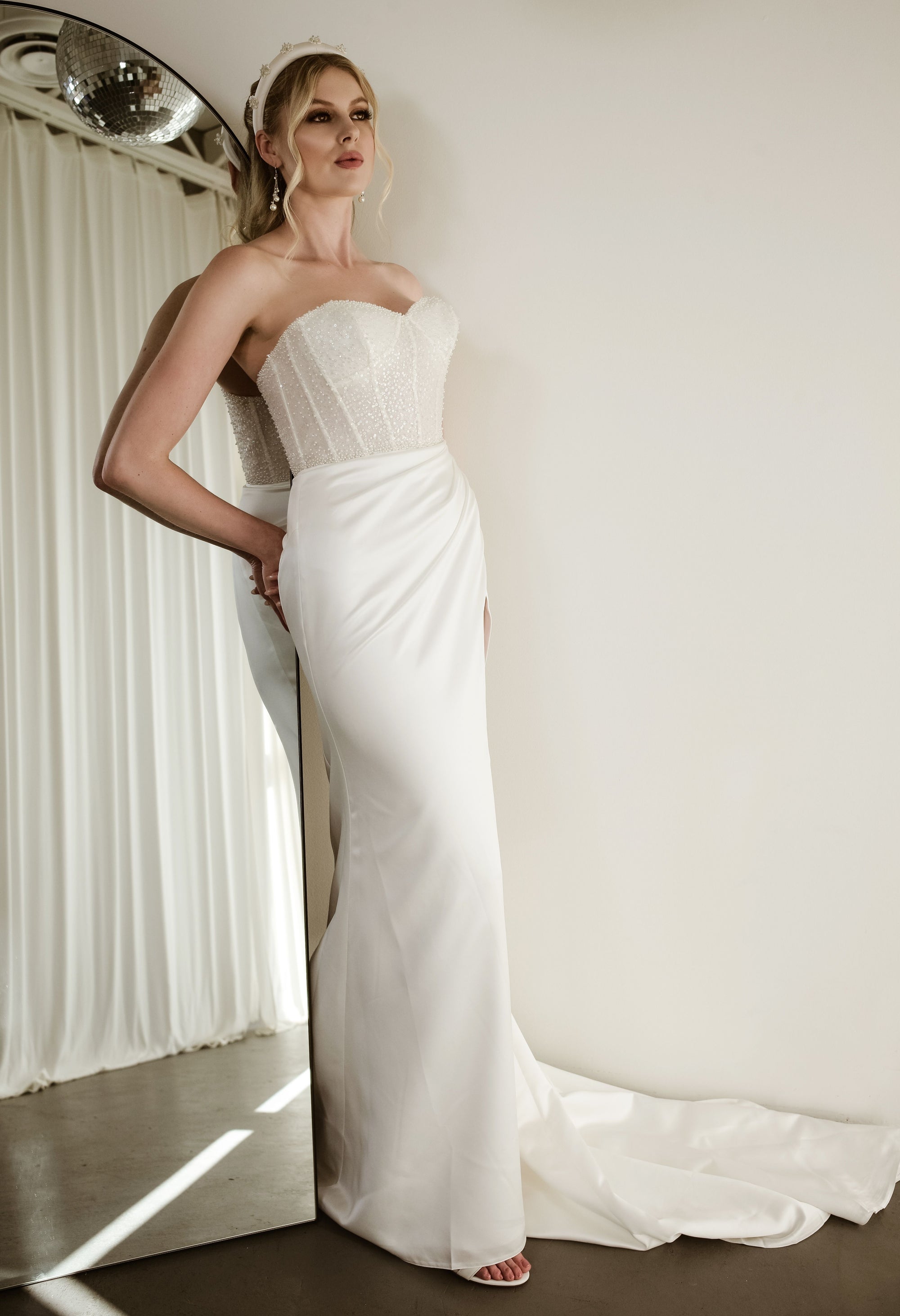 Embrace your daring side with our beaded bodice and soft satin skirt.